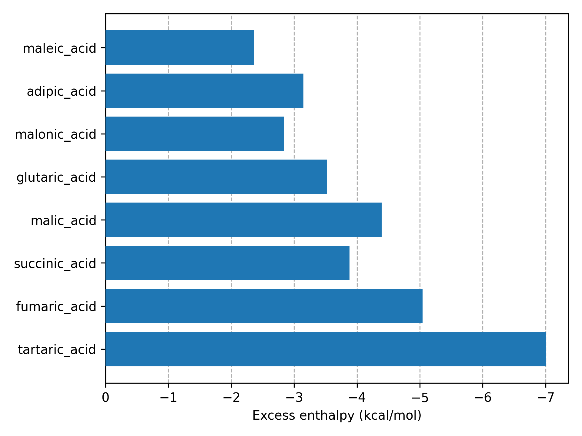 This figure (produced by the code) shows the excess enthalpy values of all solvents in a supercooled liquid mixture with Itraconazole. The lowest 4 excess enthalpy values correspond to 4 solvent for which a stable co-crystal with Itraconazole is known [1] .