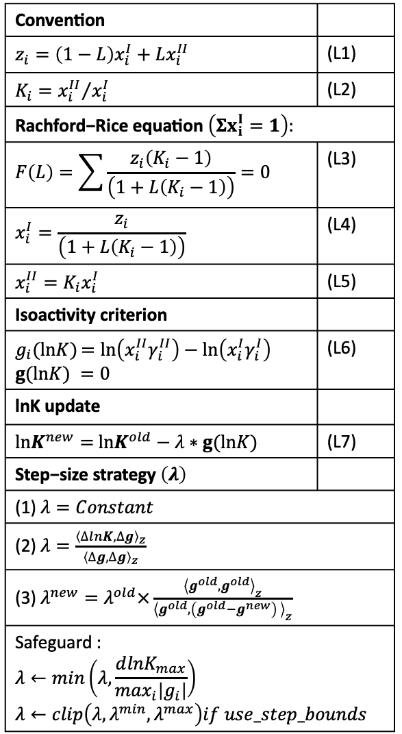 The solver uses the convention in Eqs. L1-L2, and solves the Rachford–Rice equation \(F(L)=0\) at fixed \(K\) (Eq. L3) to obtain phase compositions \(x^I\) and \(x^{II}\) (Eqs. L4–L5). The outer iteration updates \(lnK\) using the isoactivity residual \(g\) (Eq. L6) via the step-controlled update in Eq. L7.