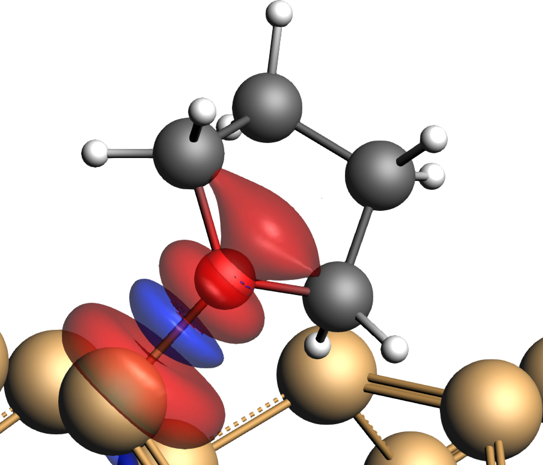Due to the elecrophile character of Sidown we can expect a dative bond between the THF O-atom and this site.