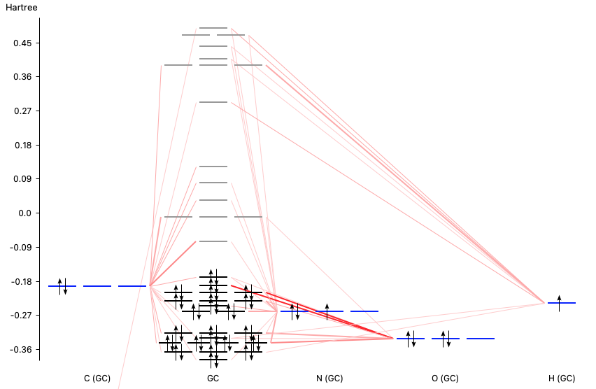 If you move the mouse over a level (orbital) of the Guanine-Cytosine DNA base pair one can find out more detailed information about the composition of the level in terms of the atomic orbitals.