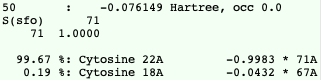 If you move the mouse over a level (orbital) of the Guanine-Cytosine DNA base pair one can find out more detailed information about the composition of the level in terms of the fragment orbitals (FOs). One can conclude that the HOMO of Guanine-Cytosine is almost purely on Guanine, whereas the LUMO is almost purely on Cytosine.