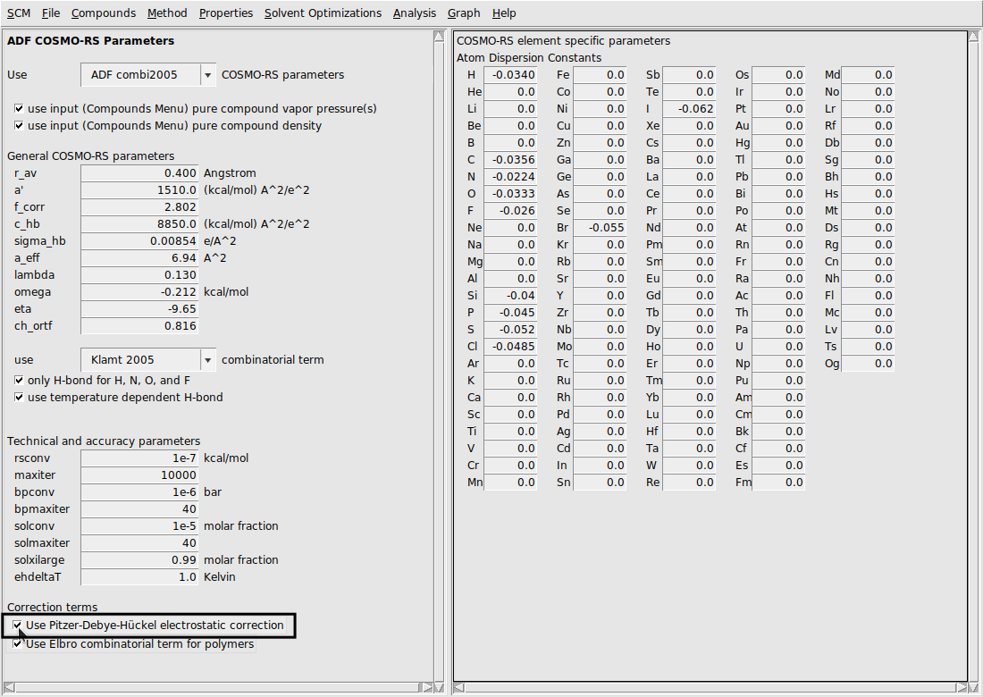 By default the PDH correction is not used. It can be turned on (or back off) in the Parameters window. If the PDH correction is turned on, it will only have an effect if there are charged species detected in the system. The following steps more exactly describe how to adjust this parameter.