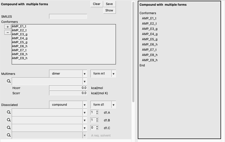 The conformations in this example may be prepared by the user, but for convenience we have included all relevant .coskf files in the link to the right. The filenames refer to the energy in the COSMO phase as well as which conformer is represented. For example, AMP_E1_t is the t-form conformer and has the lowest energy (among the 3 C-N rotamers) while AMP_E9_h is the h-form conformer and has the highest energy. Next, let’s prepare a .multiform file to use with COSMO-RS.