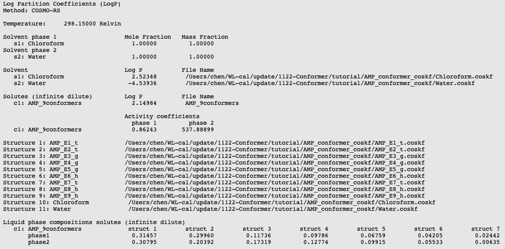 We can additionally do a logP calculation for every individual conformation. Simply delete the .multiform file from the solutes window, add all the individual .coskf files, and then click run. The results show that the calculated logP ranges from 1.98 to 2.92 for the different conformations.