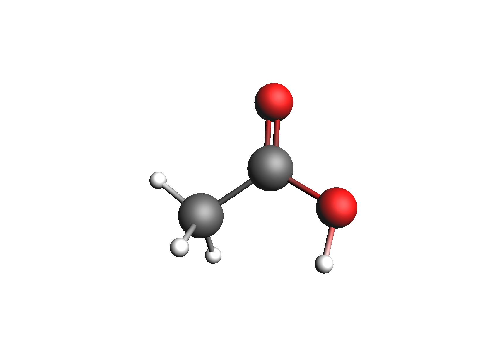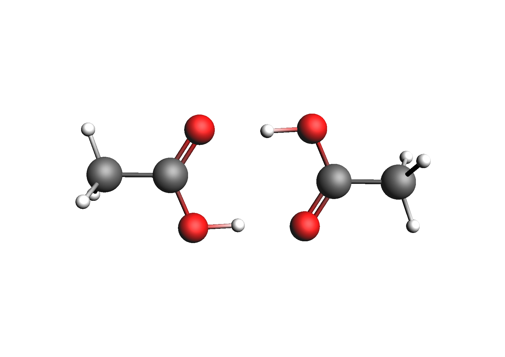 Structures used to represent acetic acid: lowest energy conformer, higher energy conformer, and dimer (clockwise from top left)