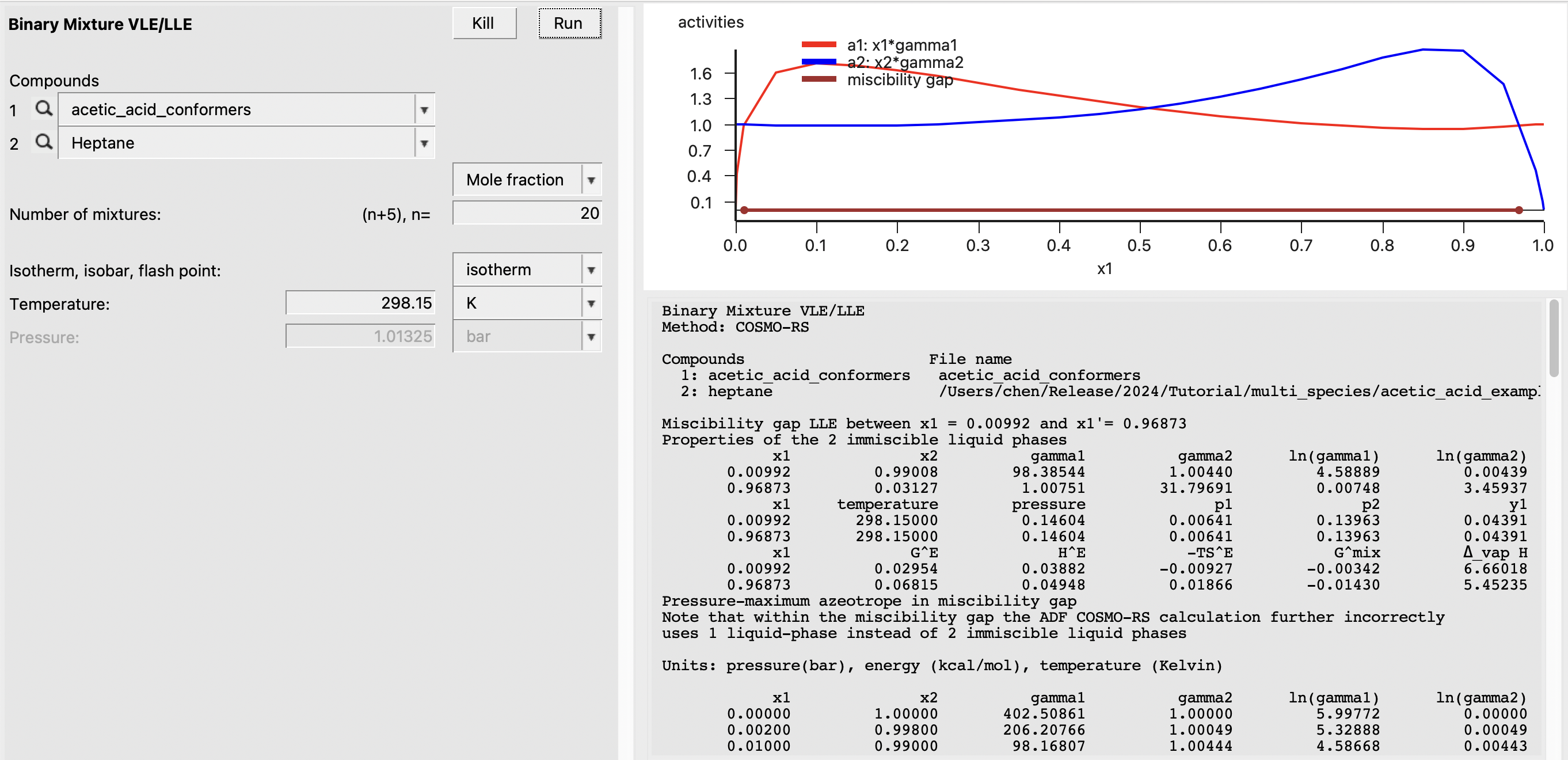 Now, we perform the same steps as above in the Binary Mixtre VLE/LLE module, except this time we will use the acetic_acid_conformers.multiform instead of acetic_2.coskf.