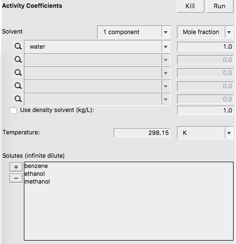 The activity coefficients a solvent and the activity coefficients of infinitely diluted solutes in a solvent can be calculated with Properties → Activity coefficients. At the same time Henry coefficients and solvation free energies will be calculated.