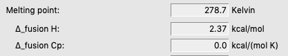 For the solubility of a solid compound in a liquid, it is necessary to include the melting point, the enthalpy of fusion, and the Δ heat capacity of fusion of the pure compound. The Δ heat capacity of fusion is optional (and often hard to find experimental numbers for), as it often makes little difference in these calculations. These required values can be input for each compound from the Compounds → List of Added Compounds menu. Here, some experimental values will be included for benzene (see, for example, https://en.wikipedia.org/wiki/Benzene).
