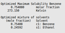 In this step a solvent is optimized in order to maximize or minimize the mole fraction solubility of a solid solute in the liquid mixture. A list of pure solvents should be provided. The optimal solution might be one of the pure solvents, but might also be a mixture of these solvents. Note that if the optimal solution is a mixture of solvents, no check is done whether these solvents are in fact miscible. Note that for the solubility of a solid compound it is necessary to include the melting point and the enthalpy of fusion of the solid. First we try to optimize the solvents, such that it maximizes the solubility (mole fraction) of solid benzene