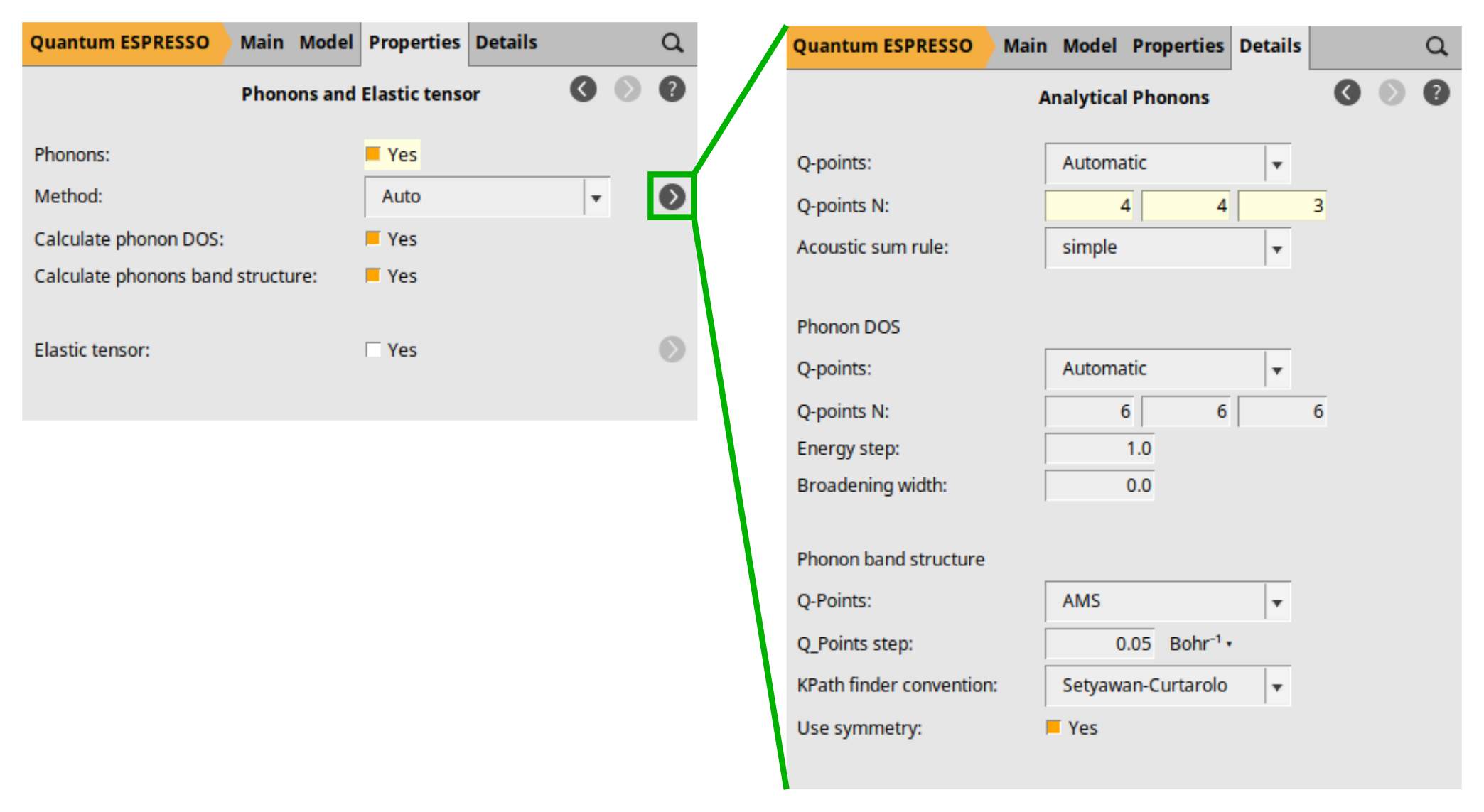 Now, use the panel bar Properties → Phonons and Elastic Tensor command to go to the Phonons (and Elastic Tensor) configuration panel. Then: