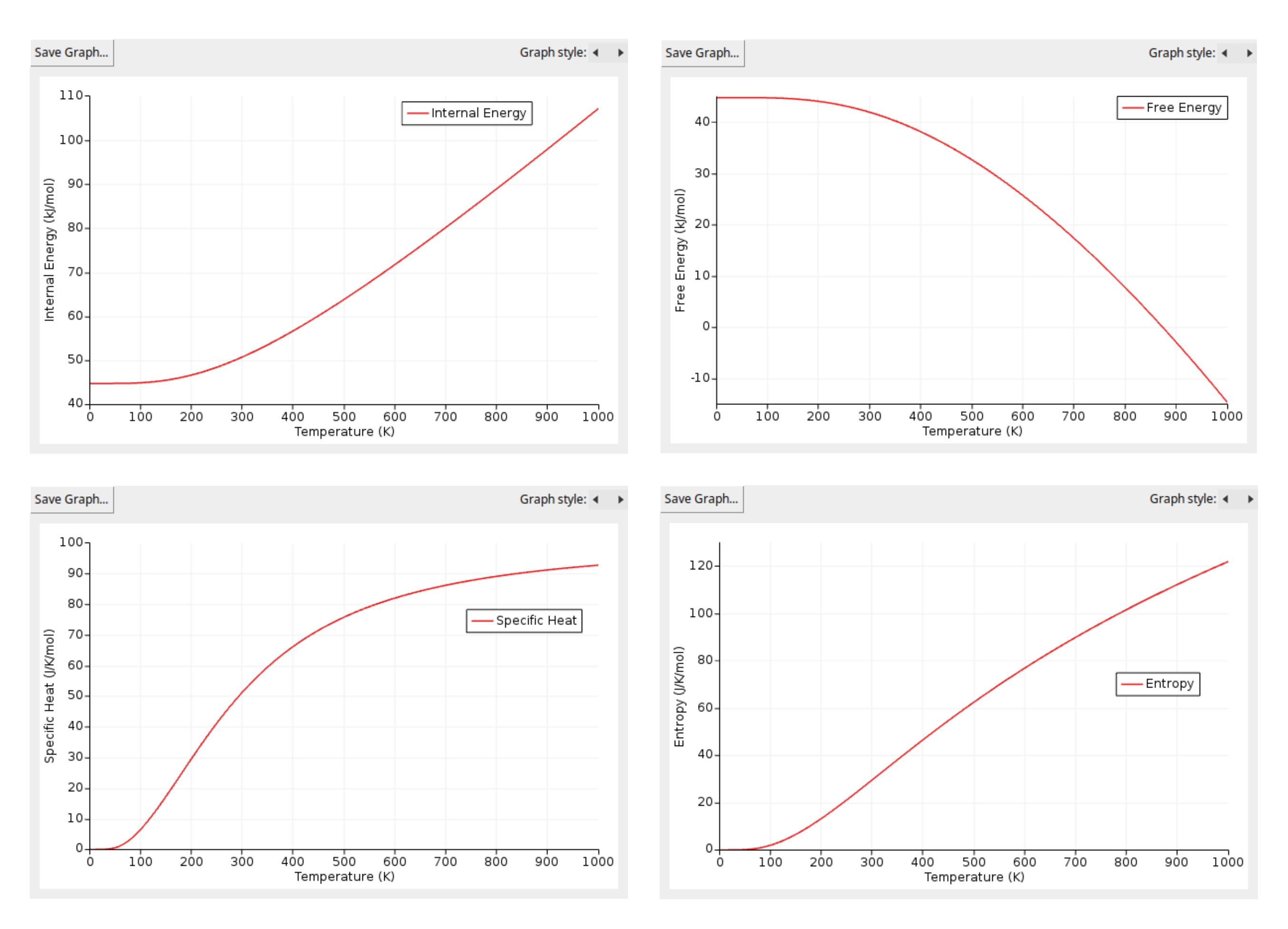 In these plots, double-click on the y-axis to change the units, for example, from Hartree to kJ/mol for internal energy and free energy, or from kB (Boltzmann constant units) to J/K/mol.