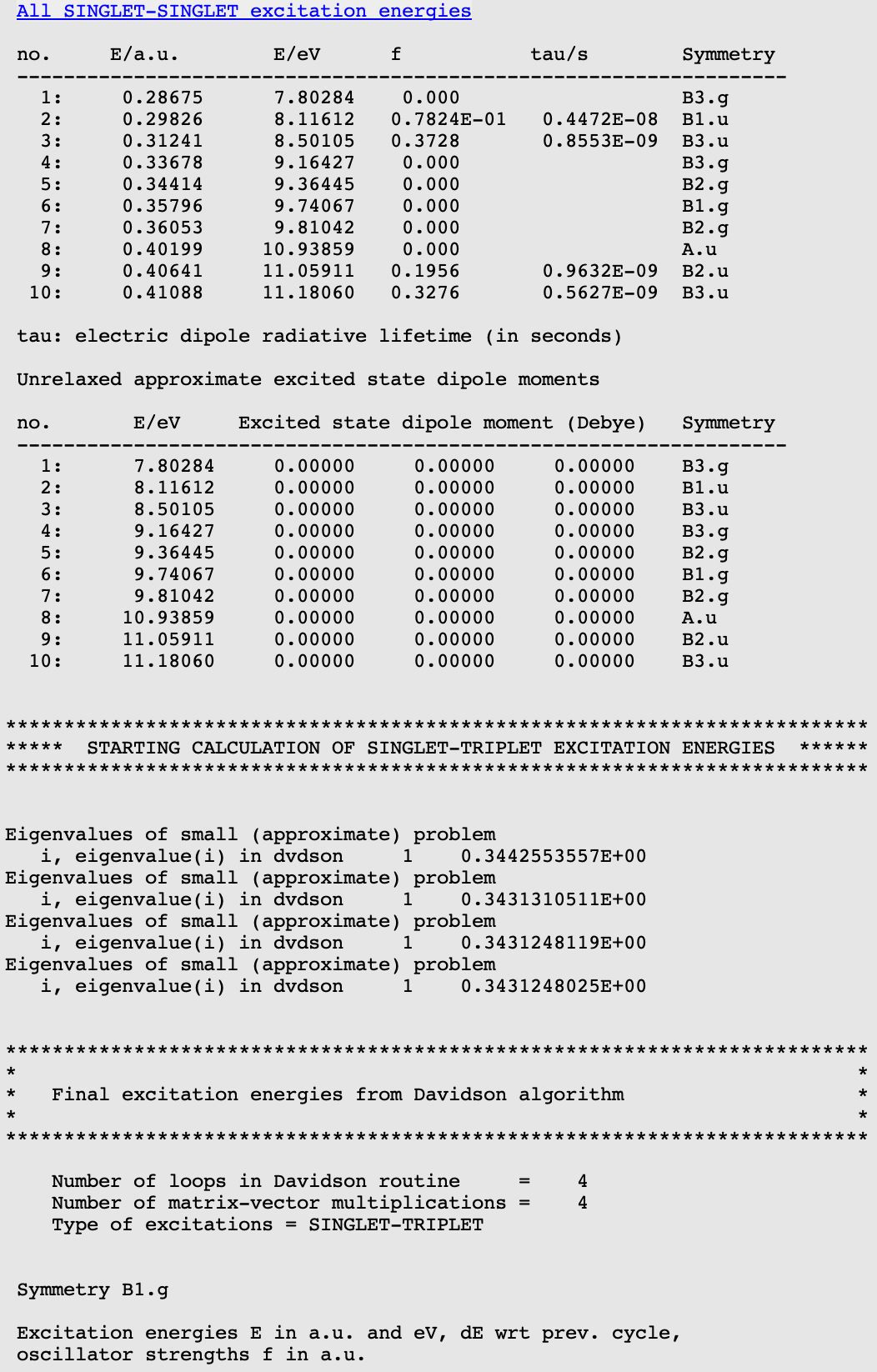 Using the output browser you can find all details about your excitation calculation. Use the menu to jump to the relevant part of output: