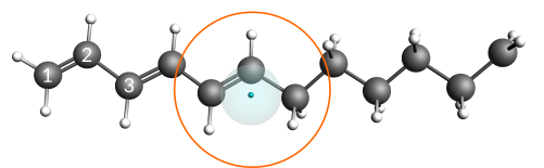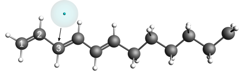 and select MovieYou should see the electron diffusing through the hydrocarbon radical. The electron diffuses rather effortlessly through the conjugated chain, while the intersection between the aliphatic and conjugated parts is a point with slightly higher stability. This slightly higher stability is the reason why the electron is often seen in the vicinity of this region.