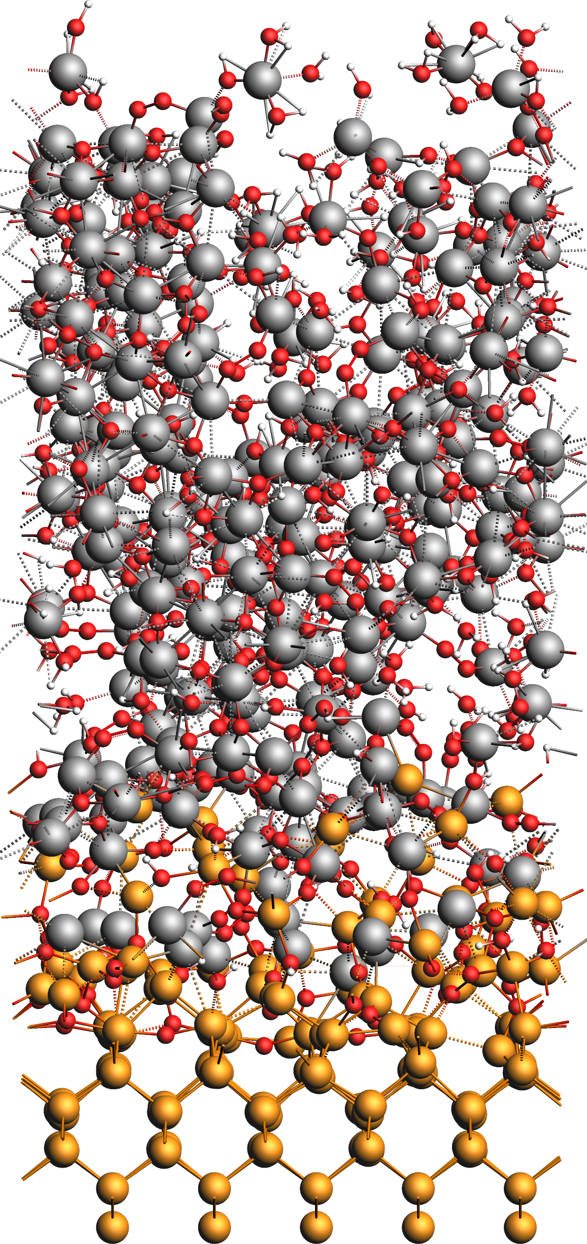 After the simulation, we obtain the model structure shown in the figure below. The original surface is covered by an amorphous interface layer followed by a thick but loose and alumina film with many absorbed water molecules and OH groups as well as several chemisorbed aluminum complex moieties on the surface of the film.