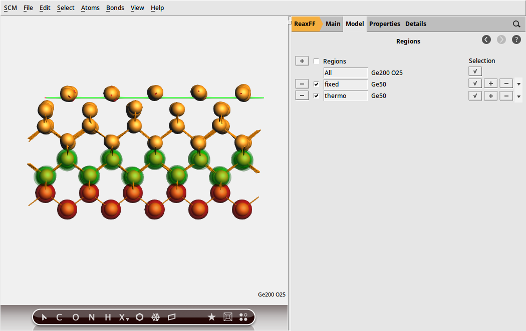 For convenience, we provide the input file for the equilibration run, Ge200O25_equilibration.ams, as well as the resulting Ge200O25.rkf file containing the equilibrated Ge(001) surface structure and atomic velocities for download.