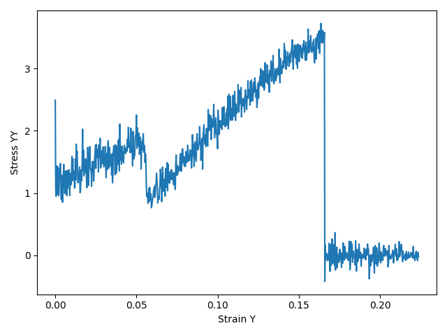 The resulting stress/strain curve can then be plotted as stress_yy (column 5) against strain_y (column 2) with any plotting software, e.g. matplotlib: