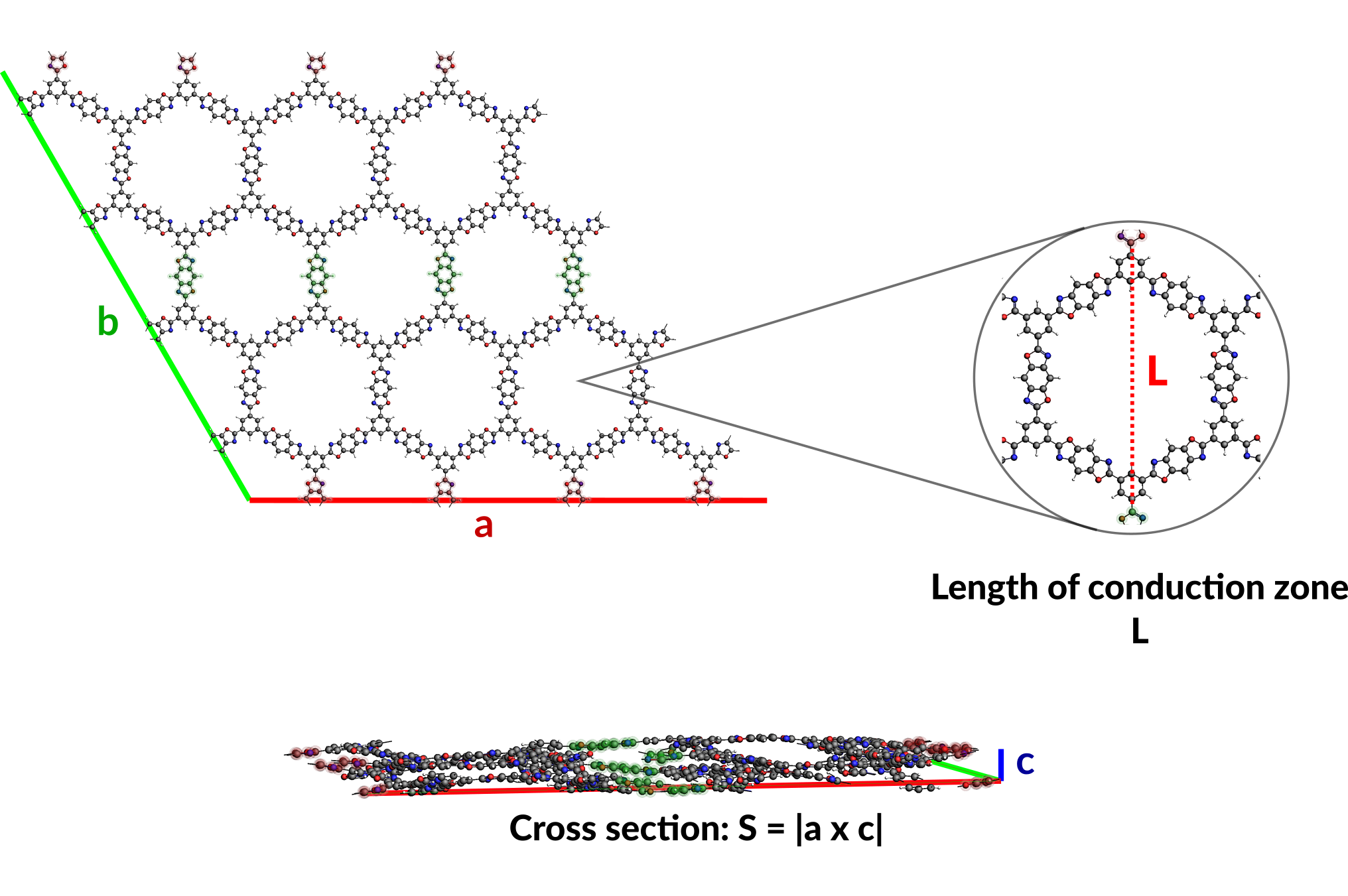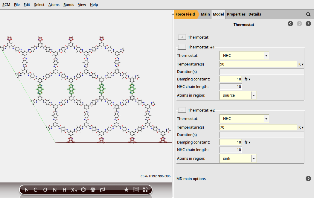 A heat flow is realized by running two local thermostats, heat source and heat sink, inside the same molecular structure. The heat source is set to be 10K above the target temperature, while the heat sink is kept 10K below the target temperature. From the energy collected at the heat sink over time and the cross-sectional area, the heat flux and thermal conductivity can be calculated. Both the molecular structure and the workflow were taken from the combined experimental and theoretical study E.M. Moscarello, B.L. Wooten, H. Sajid, L.D. Tichenor, J.P. Heremans, M.A. Addicoat, P.L. McGrier, ACS Appl. Nano Mater. 2022, 5, 10, 13787–13793.
