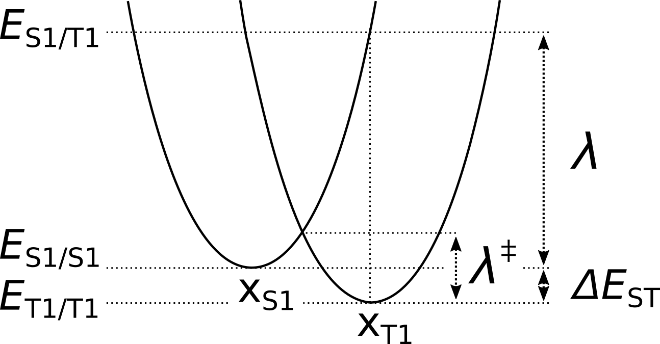 The reorganization energy \(\lambda\) can thereby be considered as the energy required to bring the system in the \(S_{\mathrm{1}}\) to the minimum structure of the \(T_{\mathrm{1}}\) state. Designating the energies of the \(S_{\mathrm{1}}\) state at \(x_{\mathrm{S1}}\) and \(x_{\mathrm{T1}}\) as \(E_{\mathrm{S1/S1}}\) and \(E_{\mathrm{S1/T1}}\), respectively, one can use