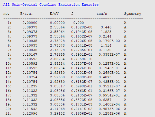 right of the XC Functional field0.225After completing this calculation, we open the results with AMSoutput and search for the results with Response Properties → All Spin-Orbit Coupling Excitation Energies:
