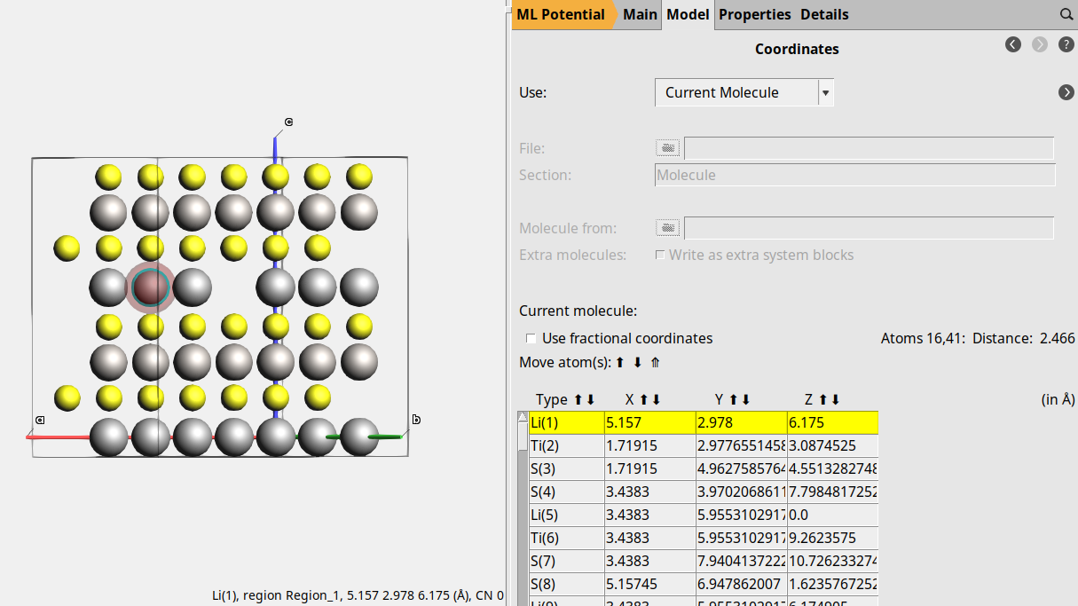 In the panel bar, go to Model → CoordinatesChange the coordinates of the first atom to5.157 2.978 6.175(the values for the atom you removed earlier)File → Export coordinates → .inUse the file nameLiTiS2_vacancy_final.in