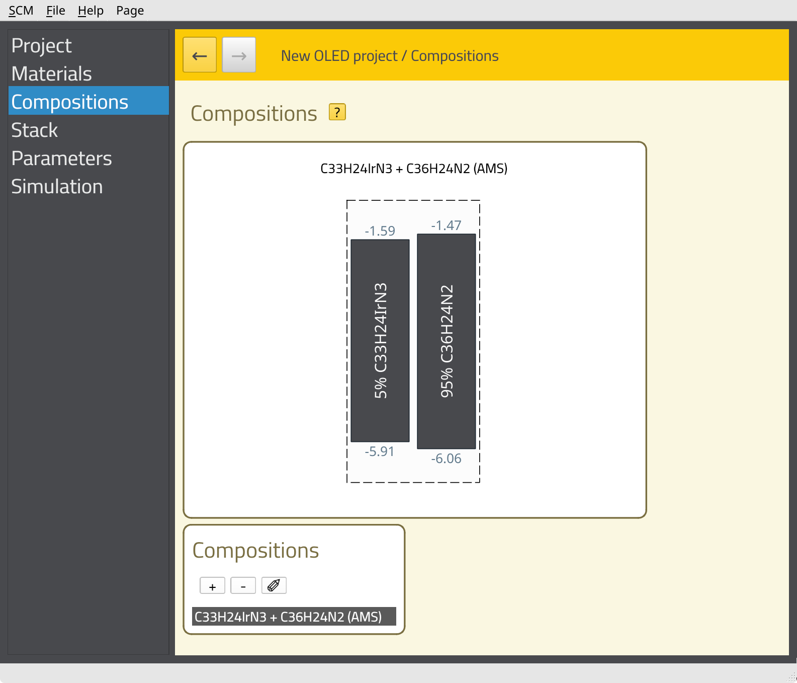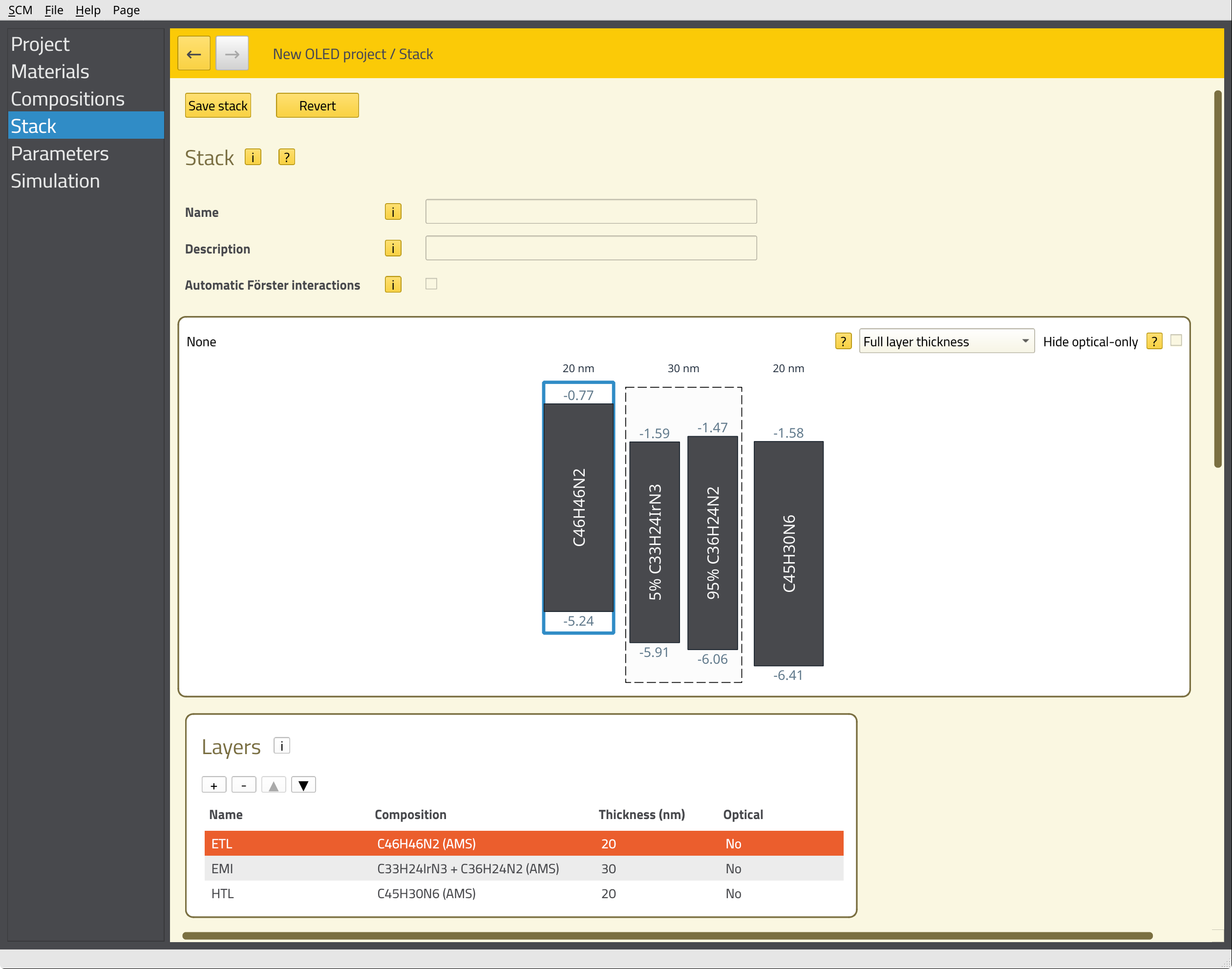 HTL by clicking the field in the Name column.EMI containing 30 nm of C33H24IrN3 + C36H24N2.ETL containing 20 nm of C45H30N6 (TPBi).The energy level diagram of the stack will be shown at the top of the page.