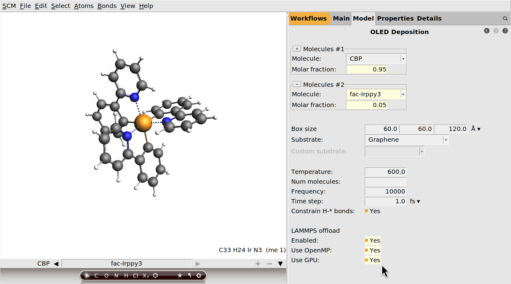 EML_deposition.The first step in the deposition workflow is a DFT geometry optimization of CBP and Ir(ppy)3. This is done to determine the atomic charges that will be used for modeling the electrostatics with the force field. See the OLED workflows manual for more information.