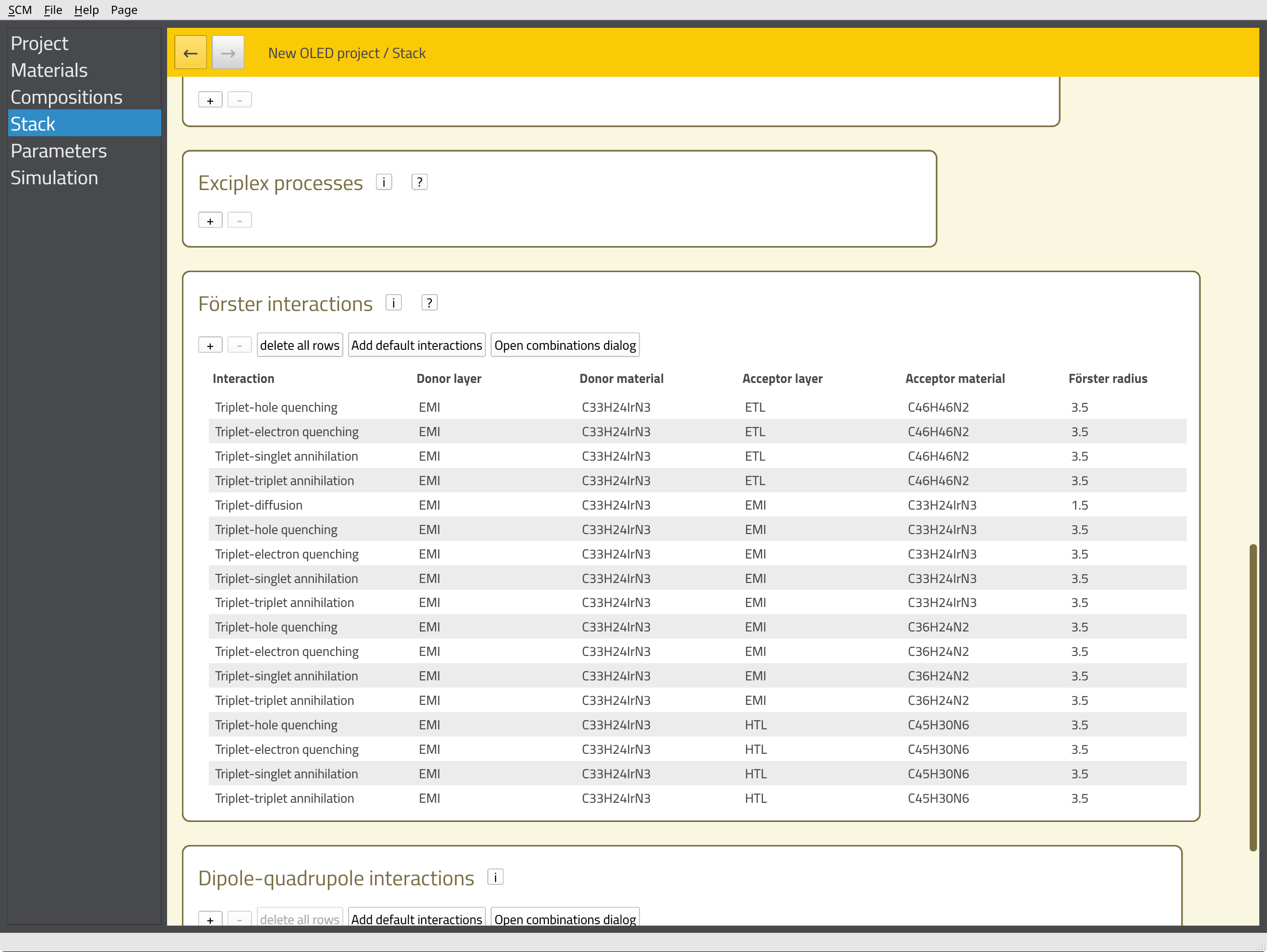 We can now define additional processes for our stack, such as degradation mechanisms or exciplex interactions. Because we are using a phosphorescent emitter, we want to include the Förster interactions here. We will have Bumblebee automatically generate these interactions for our stack by scrolling down to the Förster interactions section and clicking the Add default interactions button. This populates a table with pair-wise interaction parameters for the materials in our stack.
