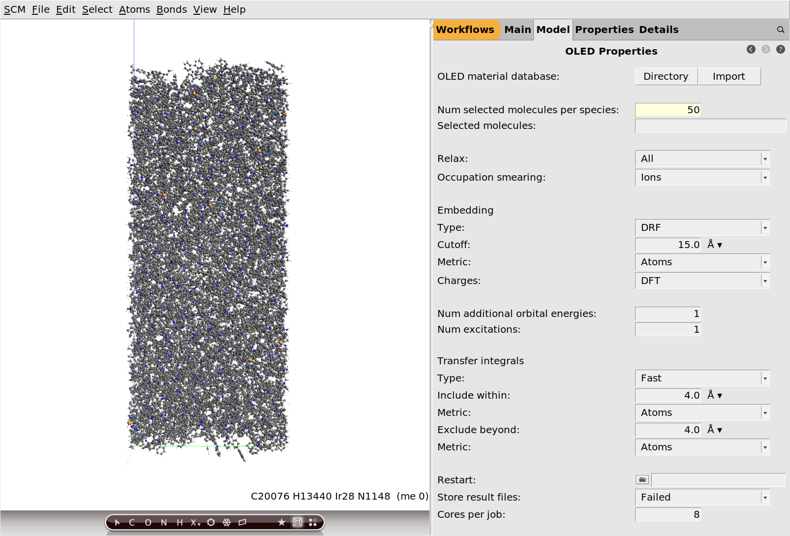 EML_properties.The OLED properties workflow is computationally very expensive, and it is not practical to run it on your local machine: we will need to use some HPC facilities to run these jobs. You can do so from AMSjobs by using a remote queue. You can find instructions on how to set up remote queues in the installation guide and the AMSjobs manual. The OLED properties workflow consists of many independent chains of calculations for the individual molecules in the morphology, making it scale very well up to hundreds of CPU cores.