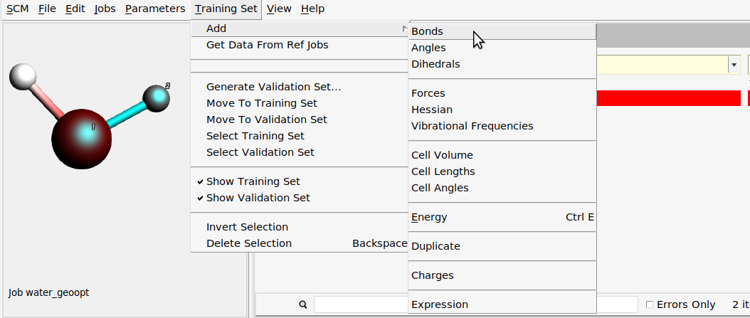 Add Single Job. This, together with Task (for new job) → PESScan, sets up an equivalent PESScan to be run during the parameter optimization. This is illustrated in the ReaxFF (basic): H₂O bond scan tutorial.