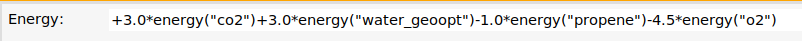 +3.0*energy("co2")+3.0*energy("water")-1.0*energy("propene")-4.5*energy("o2"). Here the coefficient before propene is 1.0 as specified in the previous step.