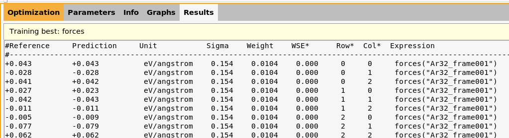 Further down in the file are the energies. In the row energy the N is 2 (the total number of energy entries in the training set). The entry Ar32_frame003-Ar32_frame002 has N = 1, since the energy is just a single number. In that case, the MAE and RMSE would be identical, so the file gives the absolute error in the MAE column and the signed error (reference - prediction) in the RMSE column.