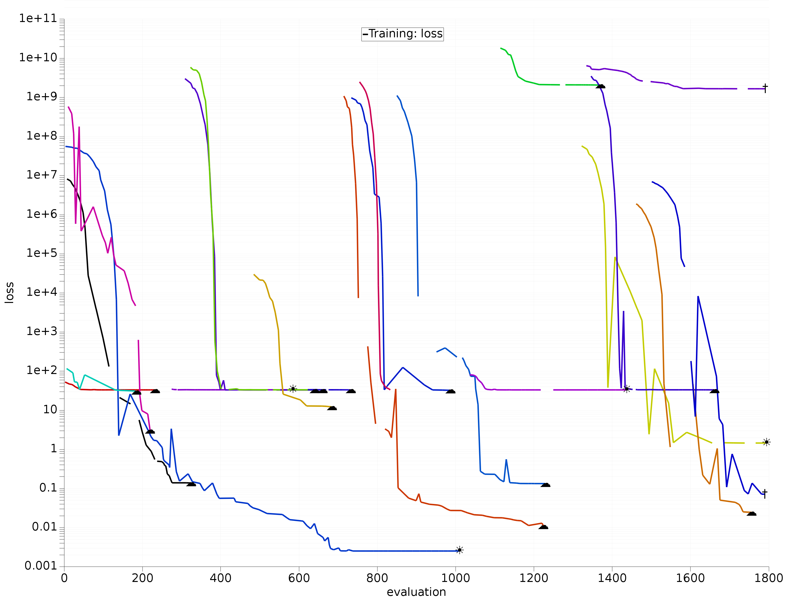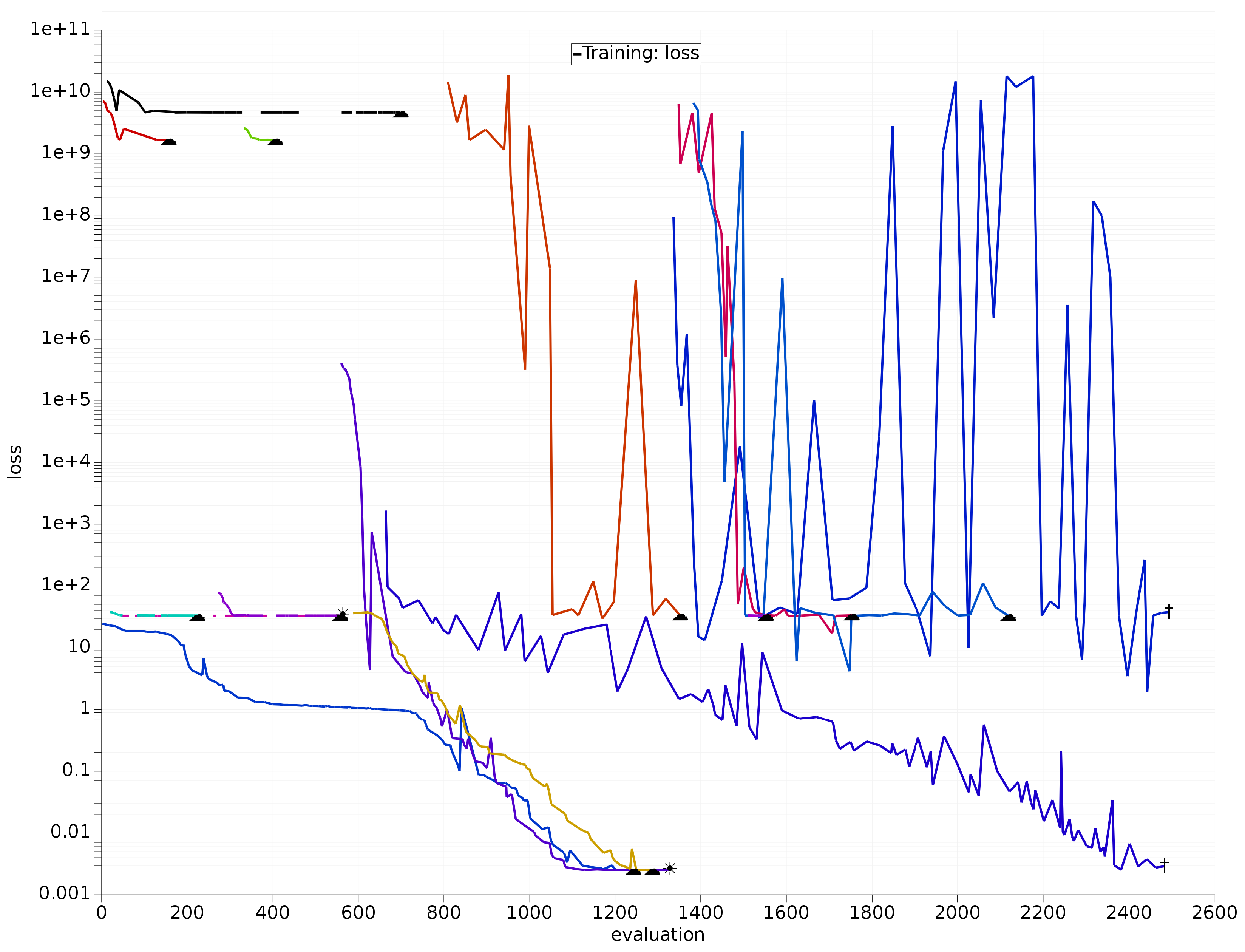 Fig. 5.6 Example development of multiple optimizers with random starts, stoppers, and different types of optimizers. All optimizers started before evaluation 500 are Nelder-Mead. All optimizers started thereafter are CMA-ES.¶