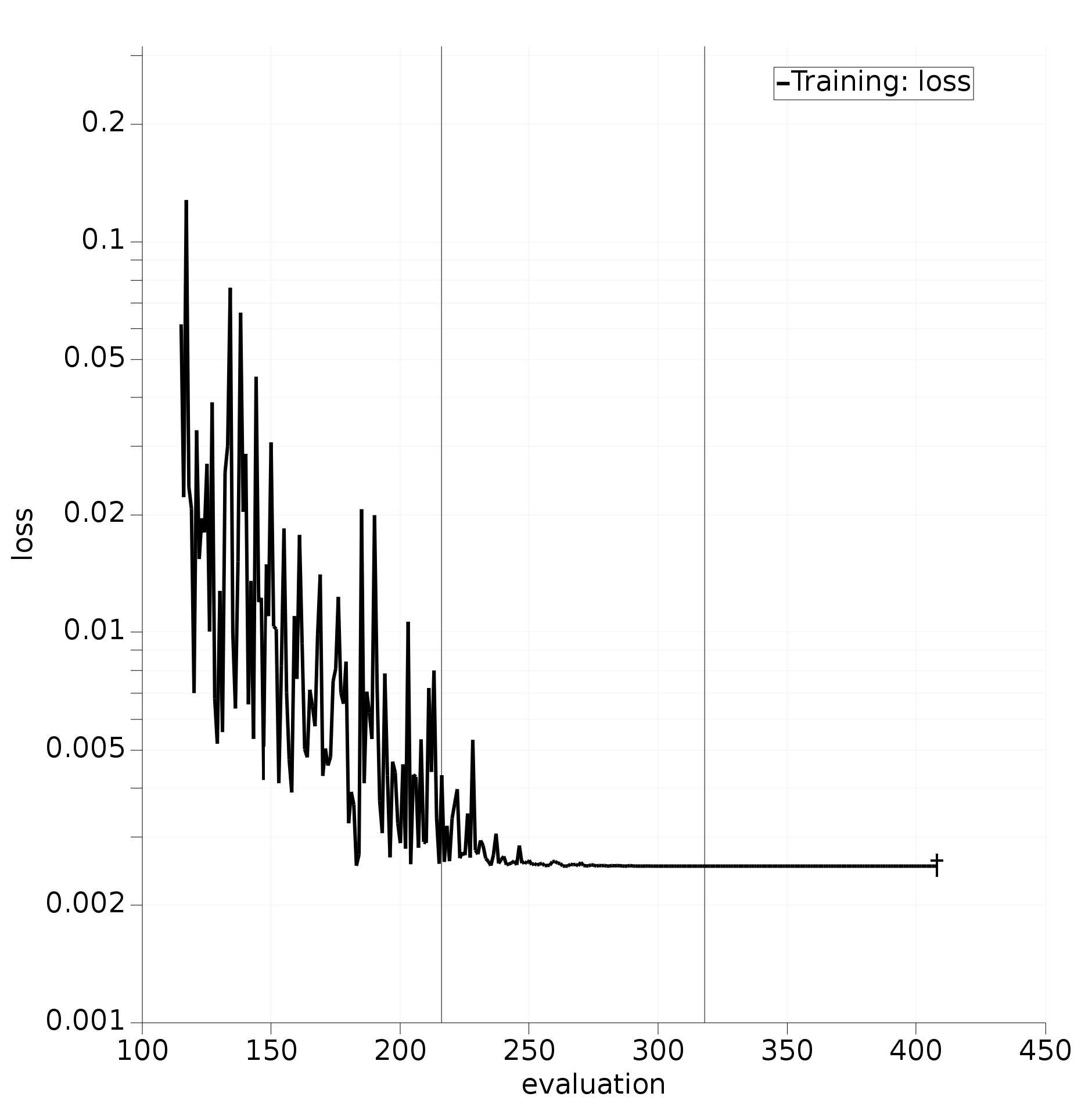 initial.paramsResults will start to develop on the Graphs panel. Black vertical lines are appended to the loss graph to indicate the points where checkpoints have been constructed: