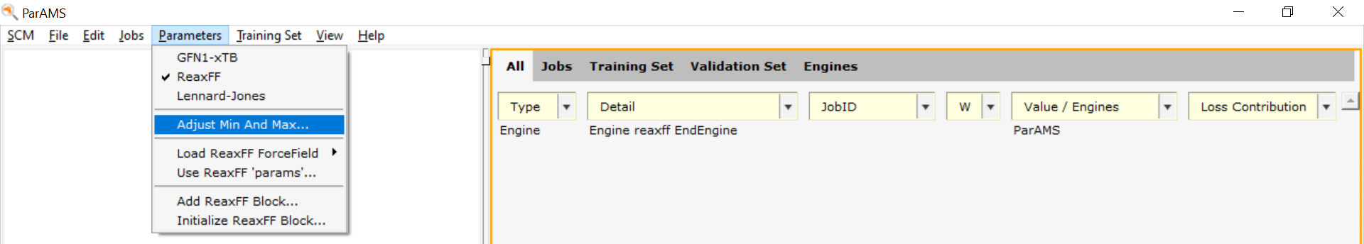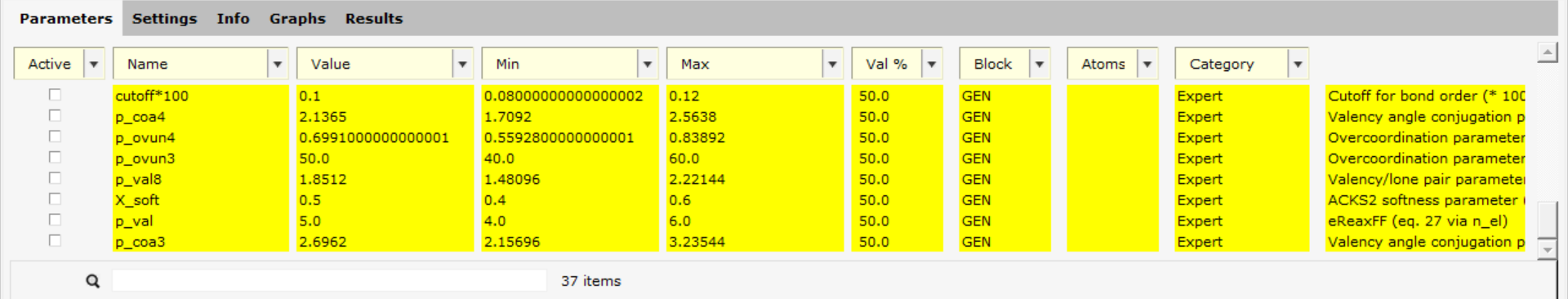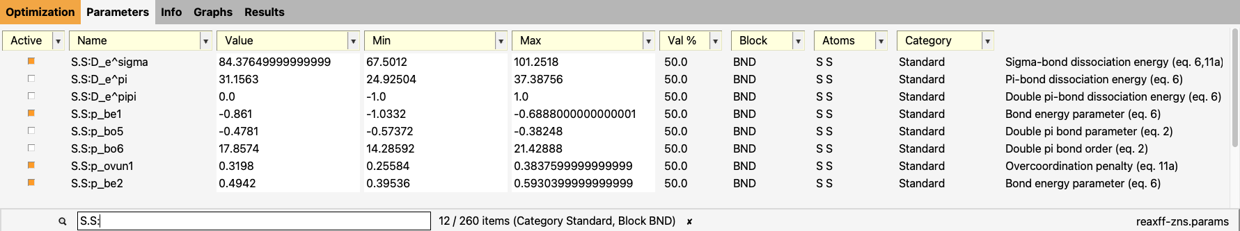 In the Parameters tab, you will see the ReaxFF parameters in the GEN block. Those parameters always exist for any ReaxFF force field.