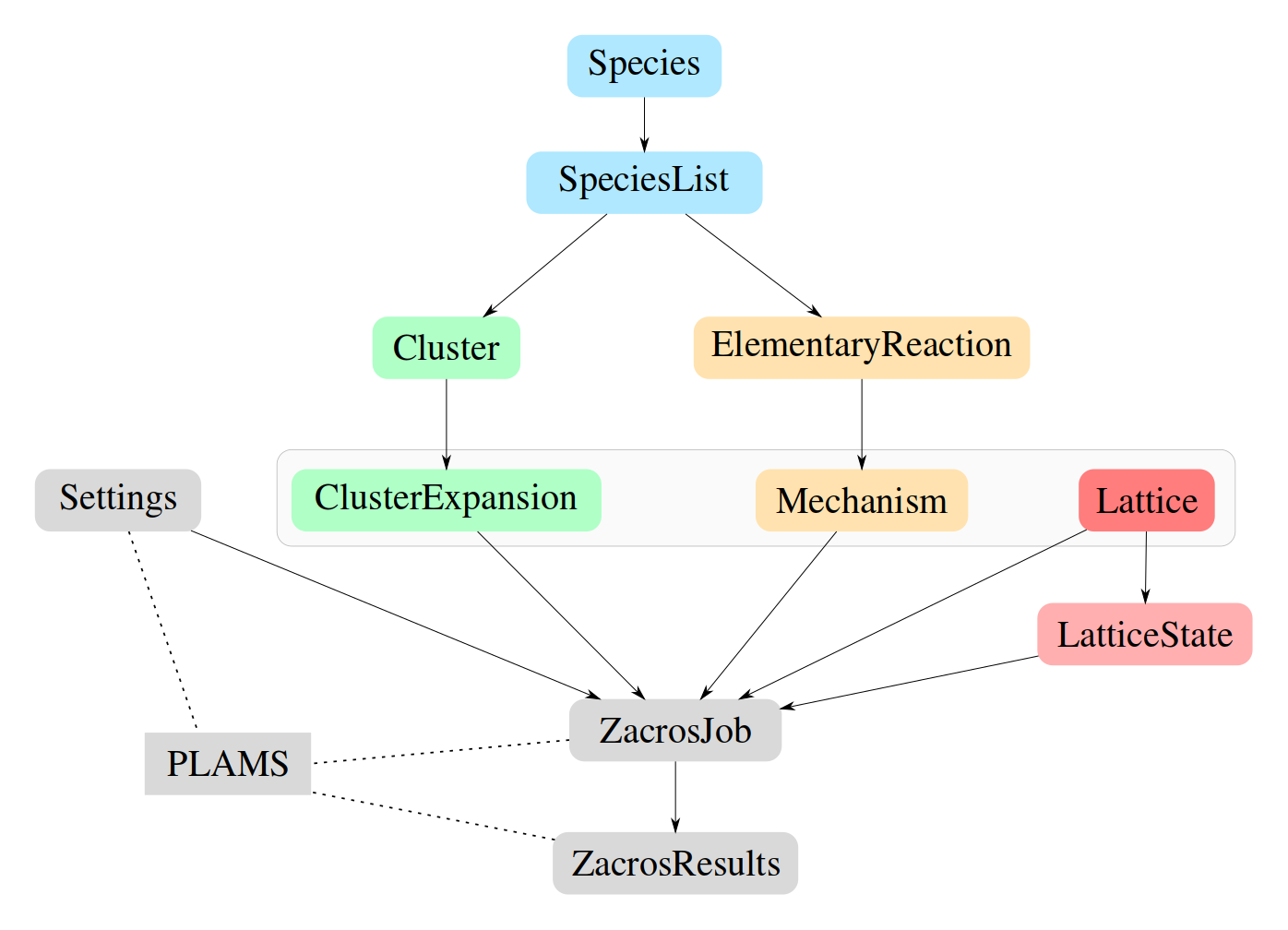 The classes represented in gray boxes are extensions of PLAMS. Settings, ZacrosJob, and ZacrosResults are subclasses of the PLAMS classes Settings, SingleJob, and Results respectively. Thus, these classes inherit from PLAMS the robust way of managing the inputs file preparation, job execution, file management, and output file processing. In a nutshell, the class Settings is used for establishing the parameters of the calculation. The ZacrosJob class is the primary piece of computational work, and it takes care of running jobs. Finally, the ZacrosResults class takes care of the job results after the execution is finished; it gathers information about output files, helps to manage them, and extracts data of interest from them.