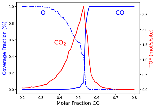 The following list of examples illustrates how to use pyZacros for running and analyzing kMC simulations.